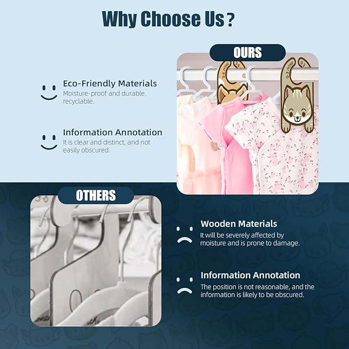 - 【Easily Divide Baby Clothes】 With clear, easy-to-read labels for different sizes and types of clothing, these 8 pack of baby closet dividers make it simple to organize and locate your baby's outfits at a glance. The baby clothes hanger dividers enhanced clarity. Each baby dividers for closet includes dividers for baby age ranges and clothing sizes, from newborn to toddler, ensuring that as your baby grows, their closet still remains neat and orderly.