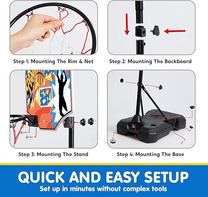 - Easy Assembly: The children's basketball set includes 4 inflatable basketballs, a pump, a basketball hoop, and other assembly accessories. The design is simple and easy to understand, making it quick to assemble and disassemble, perfect for children aged 3 to 8.