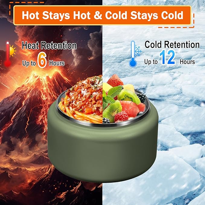 - Thermos for Hot Food: Made with 18/8 stainless steel and featuring a vacuum-sealed design, this food thermos keeps food hot for up to 6 hours and cold for up to 12 hours. It's completely reusable and made from eco-friendly, BPA-free, food-safe materials.