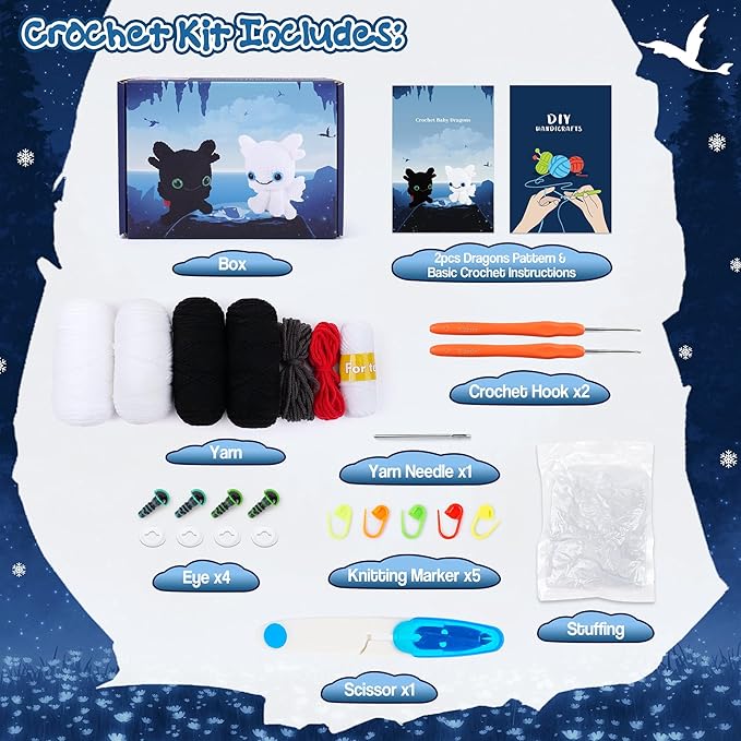 - 【All-In-One Crochet Kit】 Everthing in box: enough yarn and stuffing, crochet hook x2, eyes x4, knitting marker x5, yarn needle x1, scissor x1. In addition to the tools and materials, we come with two manuals - 2pcs Baby Dragons pattern and basic crochet instructions, as well as step-by-step video tutorials, which are perfect for beginners and kids to follow along with the videos and learn to crochet cute black and white baby dragons.