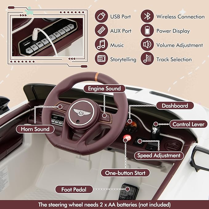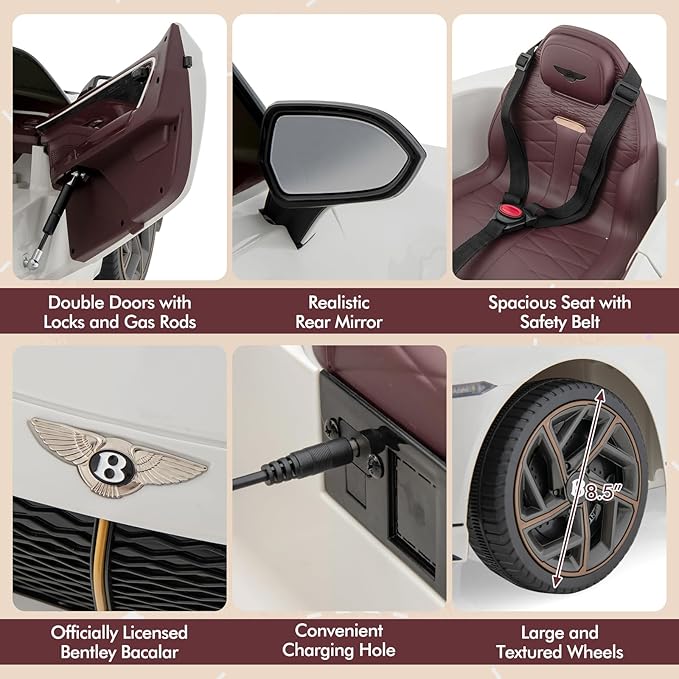 - 【Officially Licensed Bentley Bacalar】This licensed Bentley ride-on car features a super cool appearance that appeals to kids a lot. Double doors with locks and gas rods as well as realistic rear mirrors mimic the outlook of a real Bentley. Moreover, 2 × 12V powerful motors and a 12V rechargeable battery ensure profound performance.