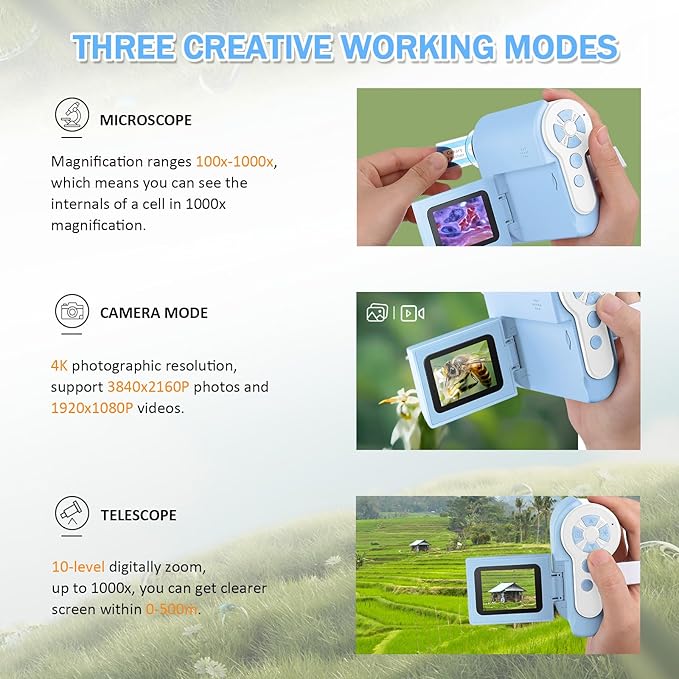 - 𝟯-𝗜𝗻-𝟭 𝗗𝗲𝘀𝗶𝗴𝗻: 1) Microscope Searching, 2) One-Click Photo & Video Recording, 3) Telescope, choose what you want to enhance child's learning experience. And this digital microscope made of 4K resolution, provides much higher clarity