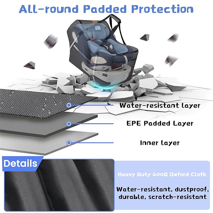 - Premium Quality: Made from heavy duty, water resistant polyester fabric, travel car seat covers for babies is easy to clean. With thick 5 Protective Bumper Feet on the bottom, padded car seat travel bag provides complete scratches protection. Car seat check bag protects baby;infant;toddler carseats from dirt, keeping baby products clean and healthy.Dual lockable zipper opening improves safety