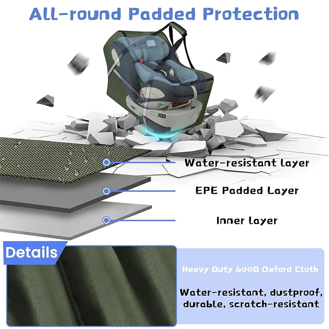 - Premium Quality: Made from heavy duty, water resistant polyester fabric, travel car seat covers for babies is easy to clean. With thick 5 Protective Bumper Feet on the bottom, padded car seat travel bag provides complete scratches protection. Car seat check bag protects baby;infant;toddler carseats from dirt, keeping baby products clean and healthy. Dual lockable zipper opening improves safety
