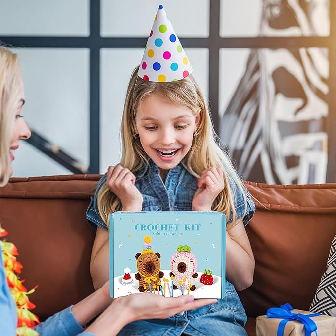 - ๐ปใAll-In-One Crochet Kitใ Everthing in box: enough yarn and stuffing, crochet hook x2, hot melt glue stick x1, knitting marker x5, yarn needle x1, scissor x1, Birthday Greeting Card x1. The crochet kit also comes with two manuals - 2pcs Capybara and 4pcs hats pattern and basic crochet instructions, as well as step-by-step video tutorials, which are perfect for beginners and kids to follow along with the videos and learn to crochet cute Capybara, red and pink strawberry/ Birthday/ Christmas hats.