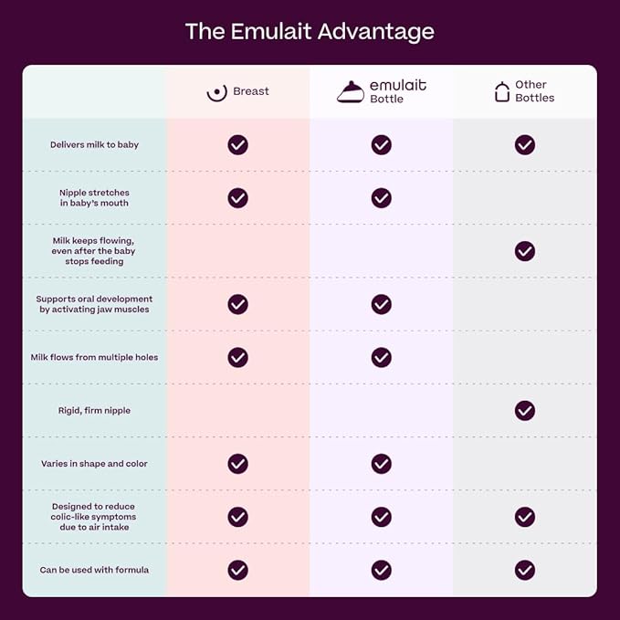 - Nurturing Breast-to-Bottle Transition: Designed to minimize nipple confusion and encourage prolonged breastfeeding, Emulait bottles offer a harmonious blend of comfort and oral development benefits. Say goodbye to preference issues as our biomimetic system ensures smooth transitions