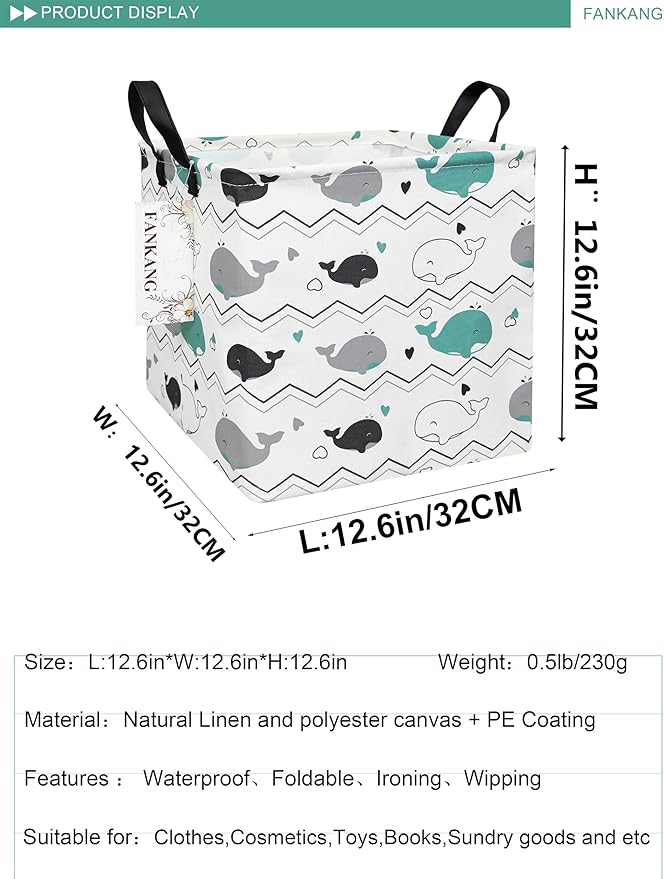 FANKANG Square Nursery Hamper Storage Bins Canvas Laundry Basket Foldable with Waterproof PE Coating Storage Baskets Gift Baskets for Children, Office, Bedroom, Clothes(Square-whales )
