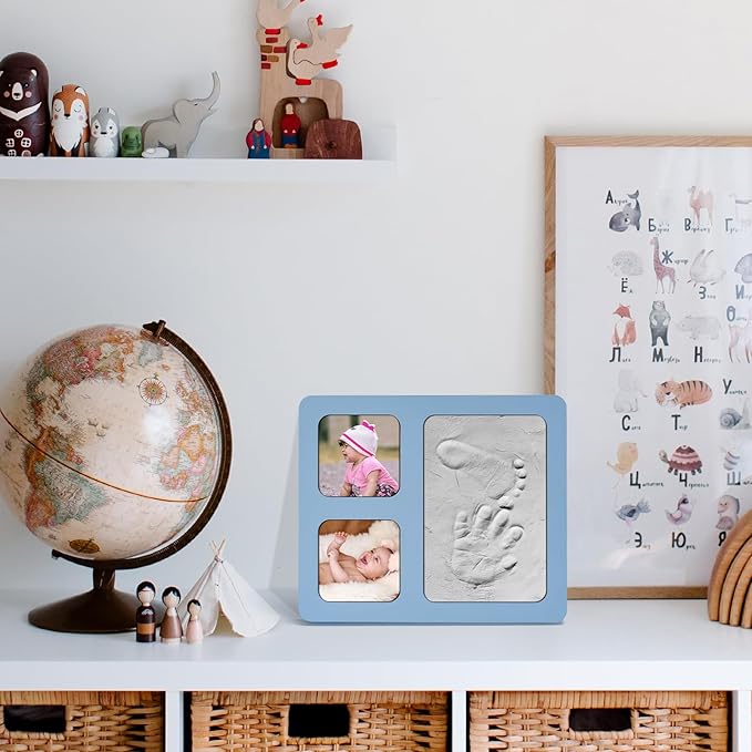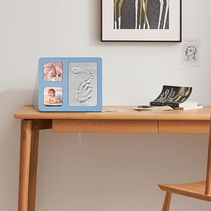 - Unique Design: The appearance of the baby hand and footprint kit frame adopts blue as the base color, and the frame has 4x6 inches of clay, which can hold 2 photos of 2.8x2.8 inches.