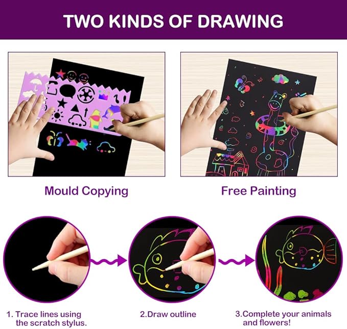 - EASY TO USE: Directly scratch the surface of black scratch off paper with the wooden stylus to reveal the amazing colorful patterns underneath. The scratch off art kit can increase visualization skills and creativity of children. It's a great way to encourage your kids 6-8 years old to write fun notes and draw pictures for each other, and for friends and family