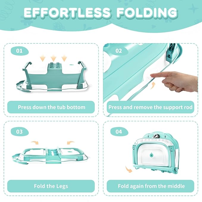 - 【Foldable Design】Want to save space? Our collapsible baby bathtub can help you easily fold to a thickness of less than 4 inches in just two steps, whether it is a corner of the bathroom at home, or a hotel on a trip, you can create an exclusive bath space for your baby anytime, anywhere, without taking up too much valuable space, and the storage is super worry-free. Suitable for babies aged 0-36 months, it is the perfect choice for parents