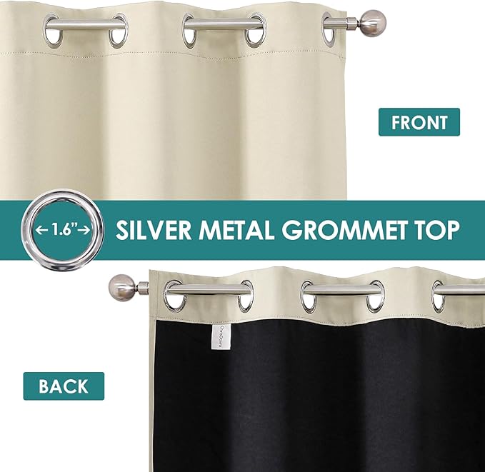 - SET DETAILS: Set of 2 total blackout curtain panels per package. Each lined curtain measures 42 inch wide by 78 inch long with 6 silver metal grommets (1.6 inch inner diameter) on top, easy to install and slide.