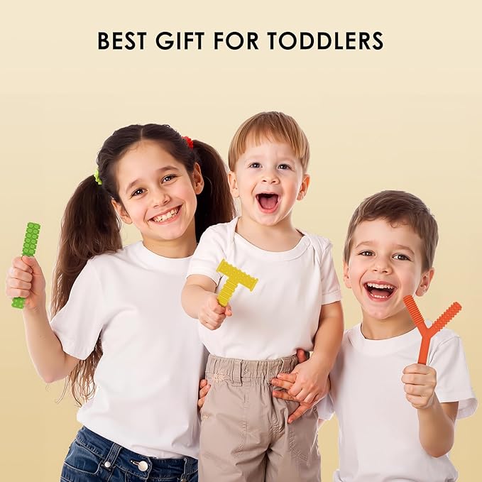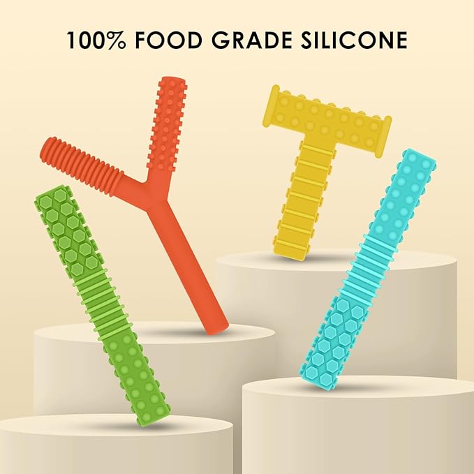 - FUN TEETHING TOYS: Our toddler teething toys set includes 1 pcs T shaped, 1 pcs Y shaped sensory chewy toys and 2 pcs teething tubes, helps keep your kids from chewing on fingers, pencils, hands, clothes, hairs, etc. Reducing stress, anxiety especially when they need to soothe, calm, or focus