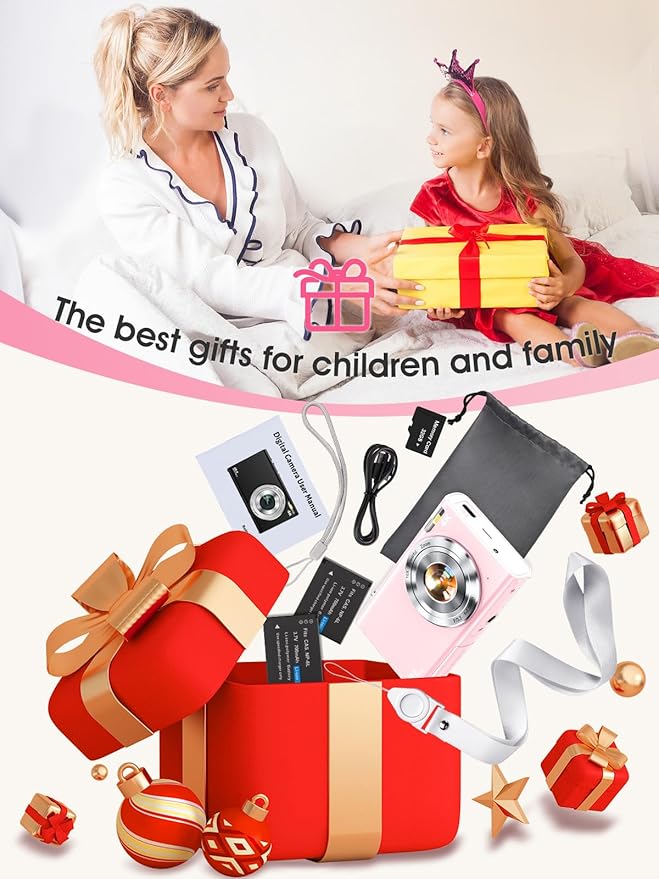 - 【Compact & Travel-Friendly with Complete Accessories】This protable small digital camera is perfect for travel or everyday use, easily fitting into your bag or pocket. It comes with a 32GB SD card, 2 batteries, and a Type-C charging cable, making it ready to use anytime. The 2.8-inch IPS screen provides an intuitive interface, so you can quickly view, edit, and share your photos. Whether as a gift for friends and family or a companion to document your own life, this camera is the ideal choice.