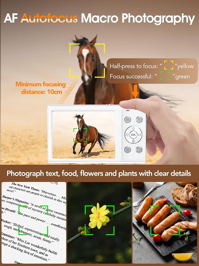 - 【Smart Autofocus, Effortlessly Capture Any Scene】 Whether you're at a friend's birthday party or a child’s sports event, the camera's autofocus system ensures you can easily capture every important moment. Simply press the shutter button for precise focus, and then press again to snap the photo, guaranteeing each shot is clear and crisp.