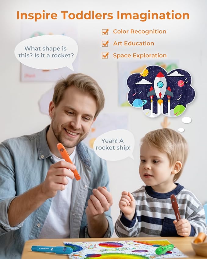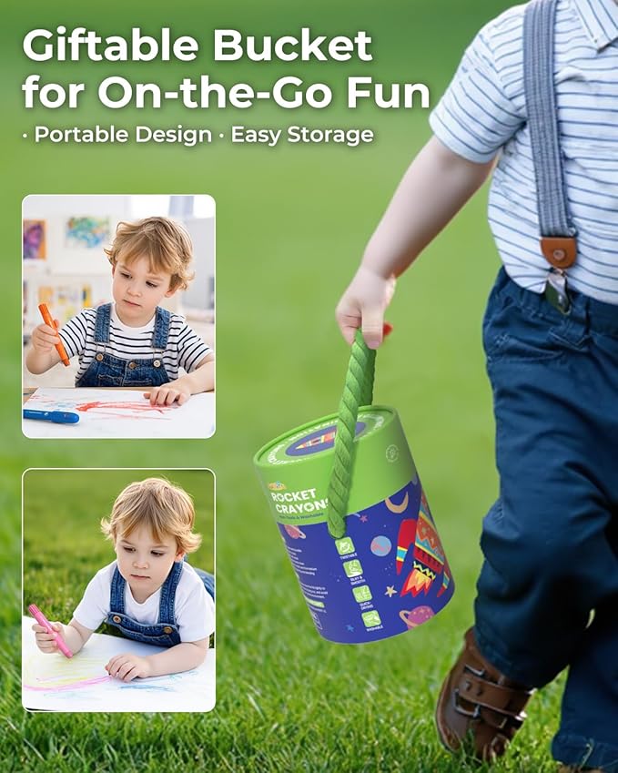 - Spark Little Imaginations with Rocket Crayons: The unique rocket-shaped design sparks children’s interest in space and science. It’s a fun way for parents and grandparents to start engaging, space-themed conversations while drawing together. Our twist crayons encourage early STEM curiosity and make learning more exciting through creative play