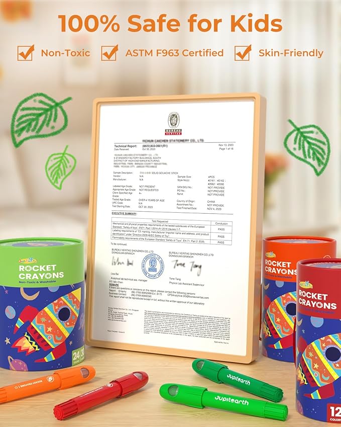 - Non-Toxic & Easy to Clean: Our non toxic crayons are safe for toddlers 1-3, 2-4, 4-8 and certified to meet ASTM F963-16/17 and EN71-3 standards. Our washable crayons clean easily from skin, furniture, walls, and clothing, making creativity worry-free at home