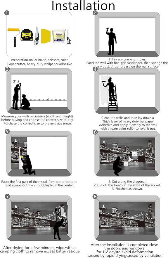 - Installation Steps1. Fill in any cracks or holes and clean the surface of the wall of dust, dirt and grease.2. Apply heavy-duty wallpaper paste to the wall, not the mural.3. Mark the position of each strip of wallpaper with a spirit level.4. Align the pattern and slide it into place.5. Scrape the bubbles with a spatula.6. Let it dry for a couple of minutes and it's ready to go!