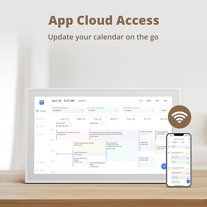 - 【Easy Setup and Auto-Sync】: Enjoy a user-friendly design that our smart picture frame allows for quick setup—just plug in, connect to Wi-Fi, and link your calendar to the Mobile App. Once synced, it seamlessly integrates multiple personal calendars (iOS, Google, etc.) into one unified interface. Authorize additional devices for even greater convenience.