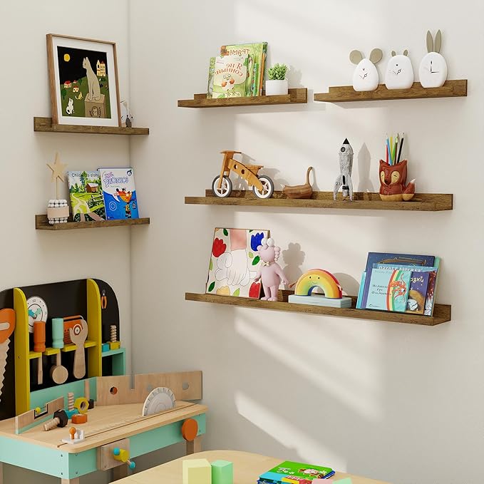 - Picture Wall Collage Decor: Do you have a lot of memorable photos, but don't know how to display them, our wood floating shelves are perfect for you! We offer 6 shelves, you can mix and match colors, height, length, and symmetry. With our long wall shelf set, your dull space will be transformed into wall art
