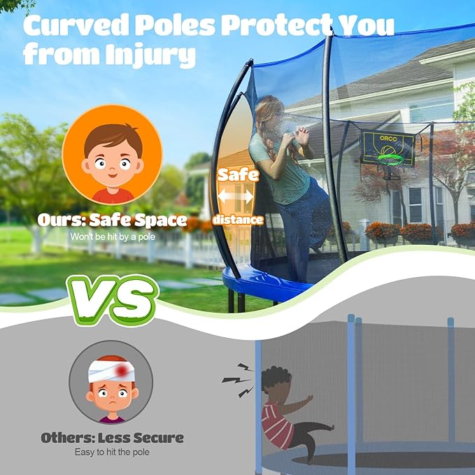 - 【Safer Structure】The ORCC trampoline features curved and thickened foam-wrapped safety poles, which increase the distance between jumpers and safety poles to prevent injuries caused by collision. Additionally, trampolines with curved safety poles provide better stability to the structure and it is not easy to roll over during the jumping process. Moreover, the reinforced safety net provides better support and can firmly hold the jumper.