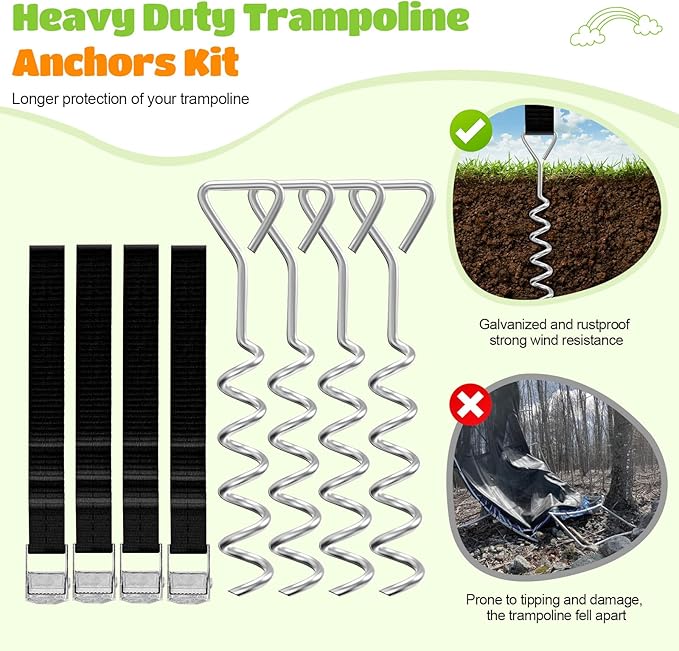 - 【Spiral Ground Stakes Enhance Stability】Experience ultimate stability with our trampoline's innovative spiral ground stakes! Designed to securely anchor your trampoline to the ground, these stakes prevent it from tipping or being blown over by the wind, ensuring endless safe and stable jumping fun for everyone.