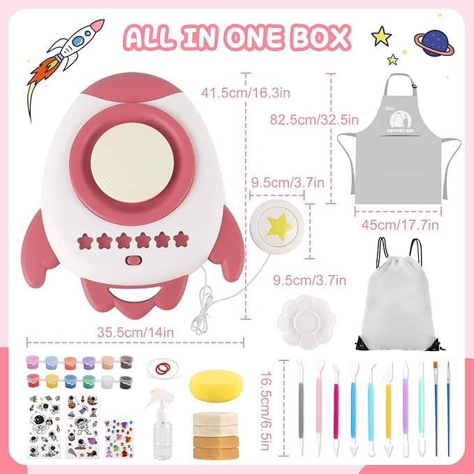 - Complete Pottery Wheel Kit for Kids: This mini pottery wheel set comes with 4 packs of air-dry clay, 12 vibrant paints, 2 brushes, sculpting tools, a sponge, a palette, an apron, a storage bag,a cutting wire, and fun stickers. A one-stop shop to meet your kids creative needs from shaping to coloring and to stimulate artistic potential. Create your own original piece of artwork