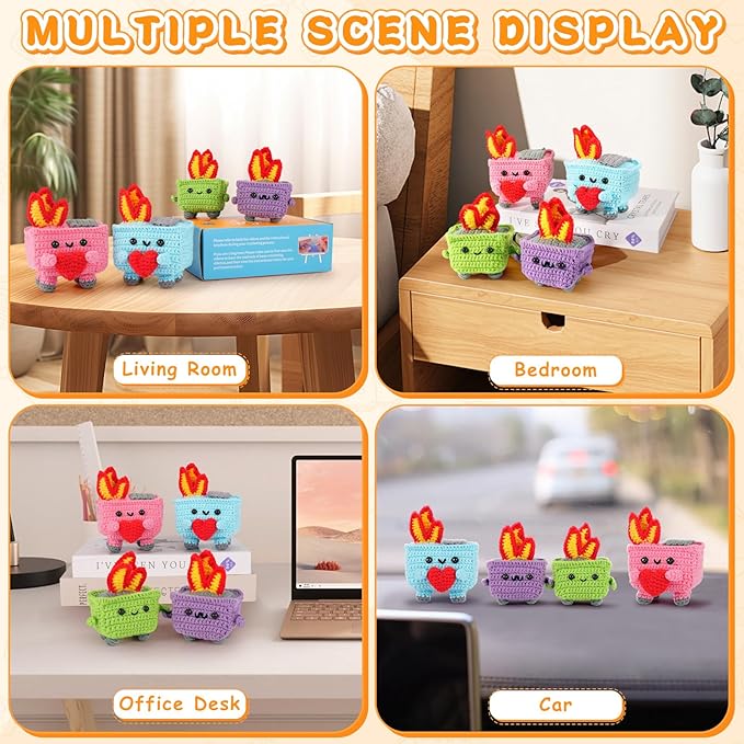 - CROCHET DUMPSTER FIRE: The crochet starter kit could crochet 4 cute dumpster fire(no card), loved by many. It will gently heal your heart as you crochet. The warm finished product can be used as a decoration and placed in the study room, living room, bedroom lamp, etc