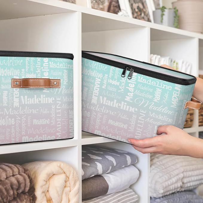 Custom Storage Basket with Name, Personalized Storage Bins with Zipper Lid, Foldable Fabric Storage Box Large capacity with Handle Green Pink