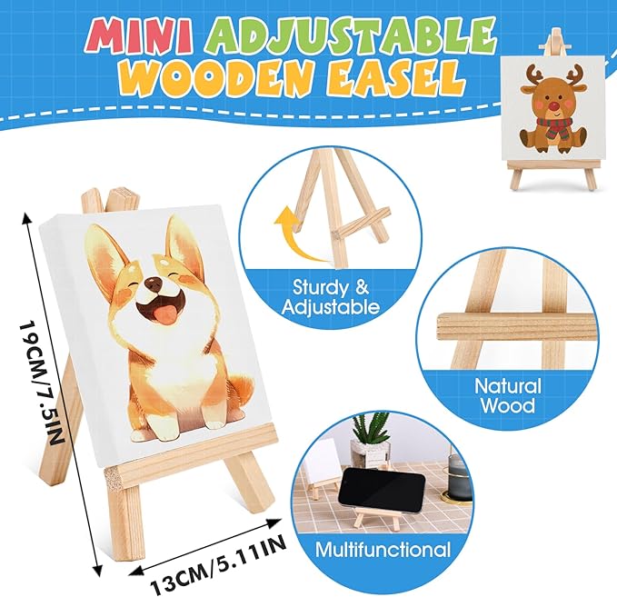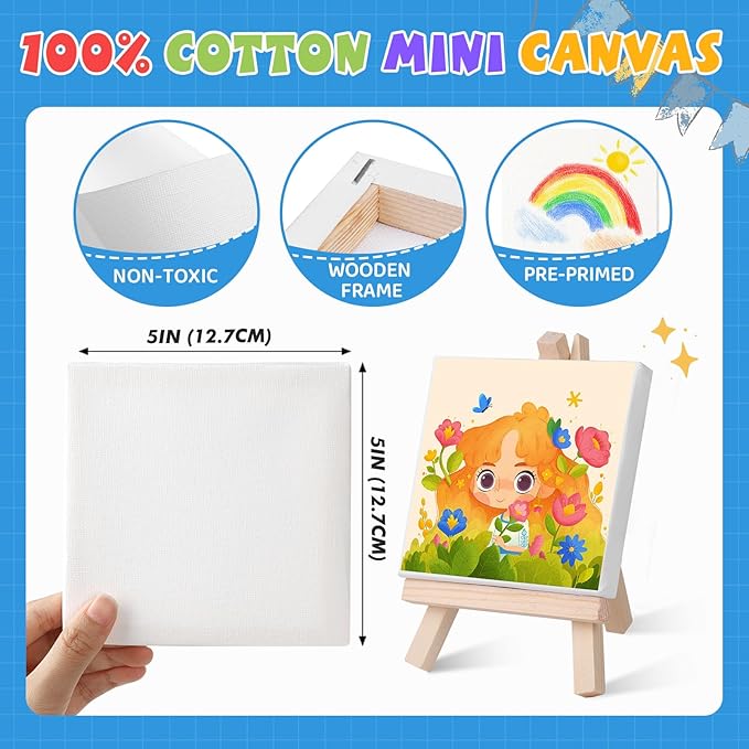 - 【 Mini stretched canvas and easel】: The 8 set mini acrylic paint set provide 5 x 5 inch small canvas with 7.5 inch mini wooden display easel. Kids can show their creations anywhere. Our mini canvas are safe and non-toxic, making them perfect for kids to use. These small easels are sturdy,can be used to hold photos, phones and more.