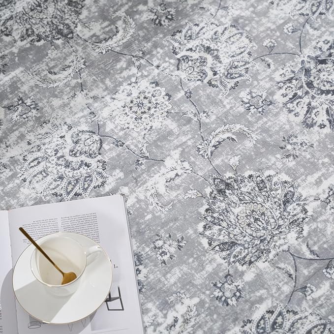jinchan Round Rug 7ft Area Rug - Grey Vintage Floor Mat Kitchen Indoor Ultra-Thin Soft Floral Print - Washable Circle 7' Retro Accent for Farmhouse Non Slip Dining Room Living Room Bedroom Office