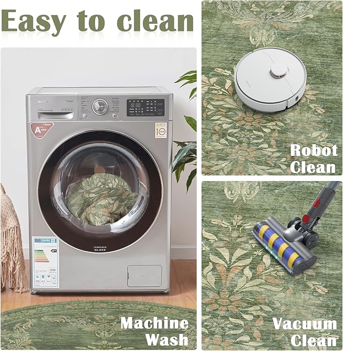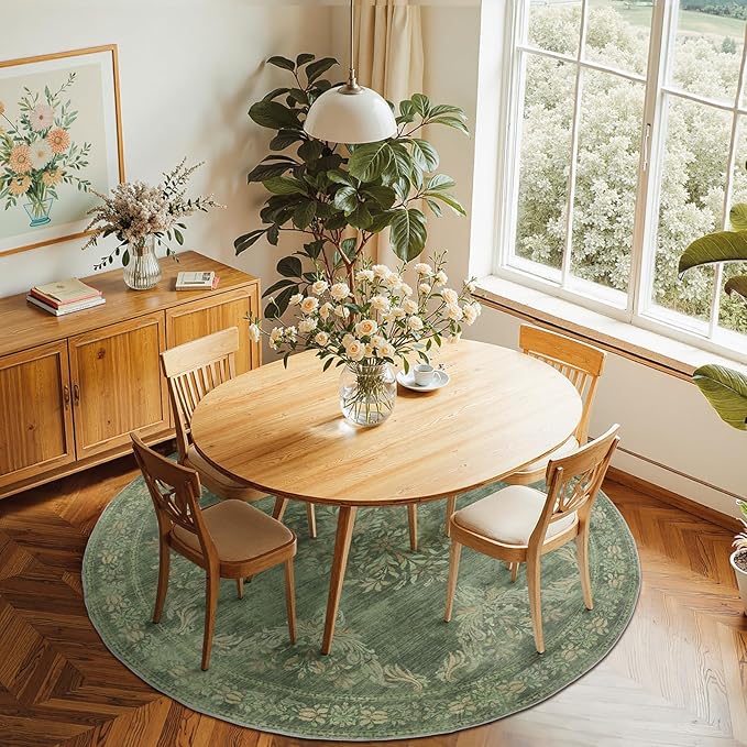 jinchan Round Rug 6ft Area Rugs Vintage Floral Distressed Design,Machine Washable Soft Non-Slip Low-Pile Ultra-Thin Circle Rug for Bedside Living Room Dining Room Bedroom (6' Round, Dark Green)