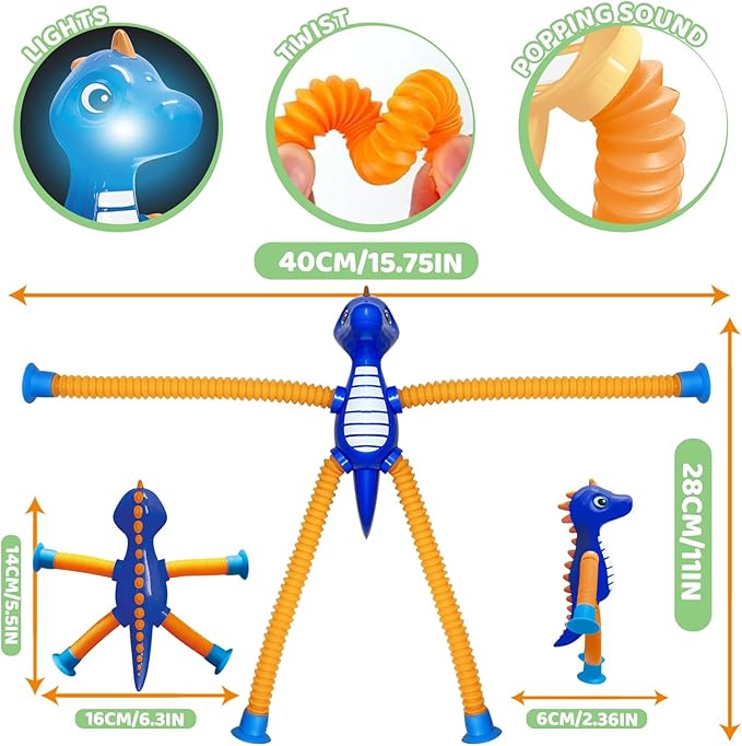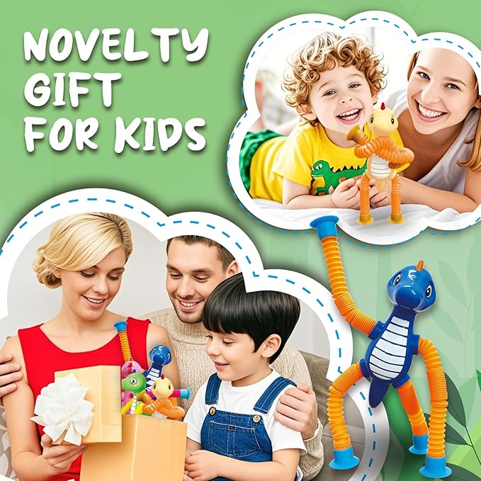 - πΌβ¨ γFUN SENSORY TOYS FOR KIDSγ: These all new design brightly colored dinosaur animal pop tube toys offer more than meets the eye. With pop tube arms and legs featuring uneven textures and satisfying popping sounds, they engage kids' senses and promote motor skill development. The added telescopic suction cup limbs enable them to attach to flat surfaces like windows or desks, introducing a new dimension of play and tactile sensation.