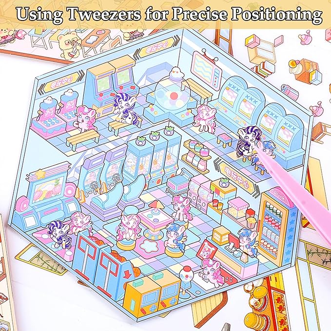 - Various Scenes: The sticker set includes 4 sticker sets, 4 background boards, and a tweezer. Scenes feature a Kapi Gym, Puppy Bun Shop, Bear Classroom, Pony Arcade. Mix and match for endless DIY 3D house creations!