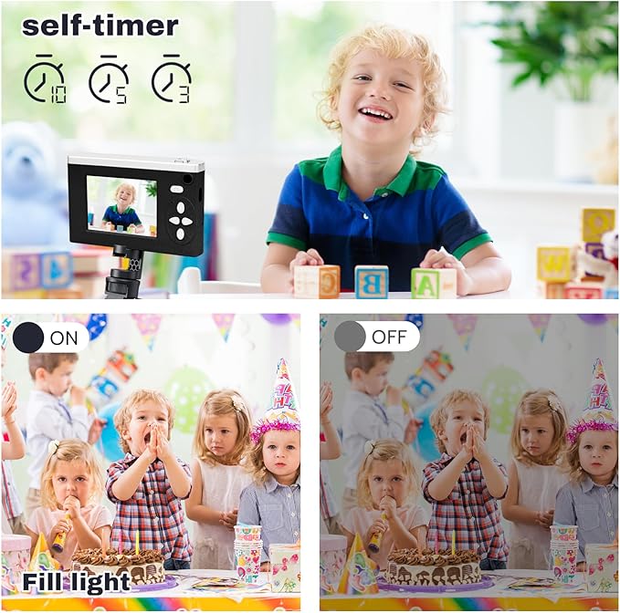 - 【Kid-Friendly Timed Shooting Mode】 Spark creativity with a simple timed shooting function, letting young photographers capture selfies, group photos, or dynamic action shots with ease