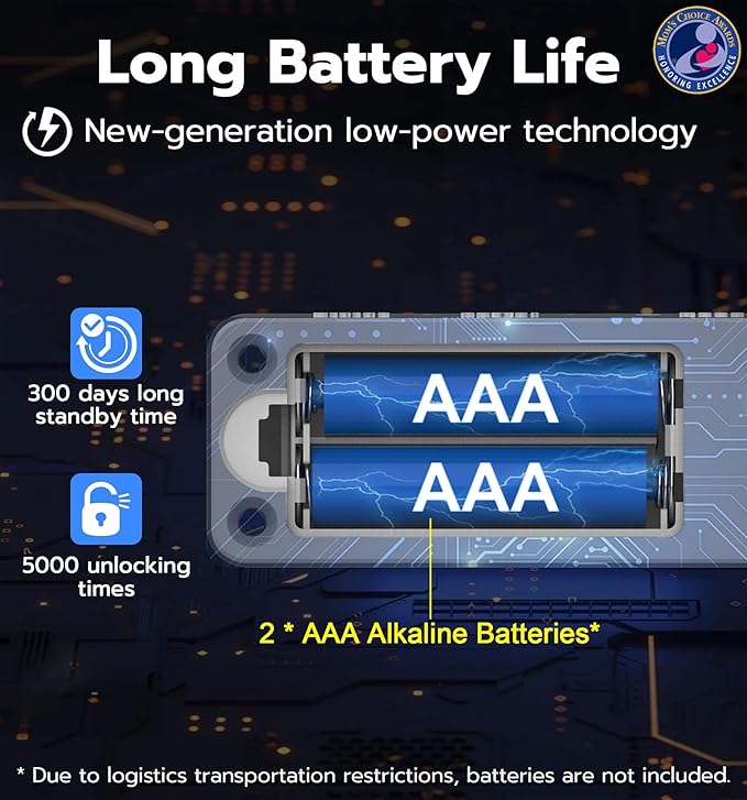 - 🔐【300 Days Standby Time】: The smart lock adopts the new generation of low-power technology to ensure long battery life. The new battery (2 x AAA batteries) can stand by for up to 300 days and unlock 5000 times. and has a battery indicator and a low battery reminder, completely releasing battery anxiety.