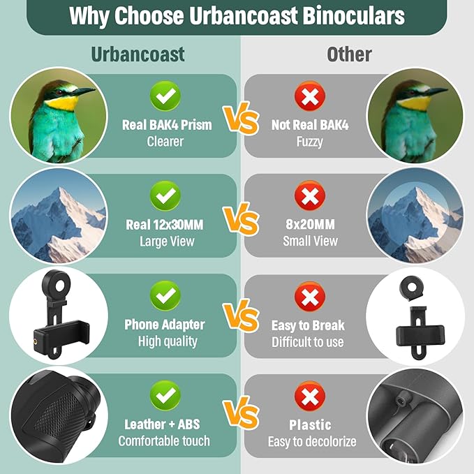 - 12X30 POWERFUL HIGH-DEFINITION BINOCULARS : With 12x magnification and 30mm large objective lens, Urbancoast small binoculars for adults and kids deliver 367ft/1000yds large field of view with clear and crisp images,letting you look father and see wider.The large eyepiece promises an immersive, comfortable viewing experience. With BAK4 prism and FMC lenses.