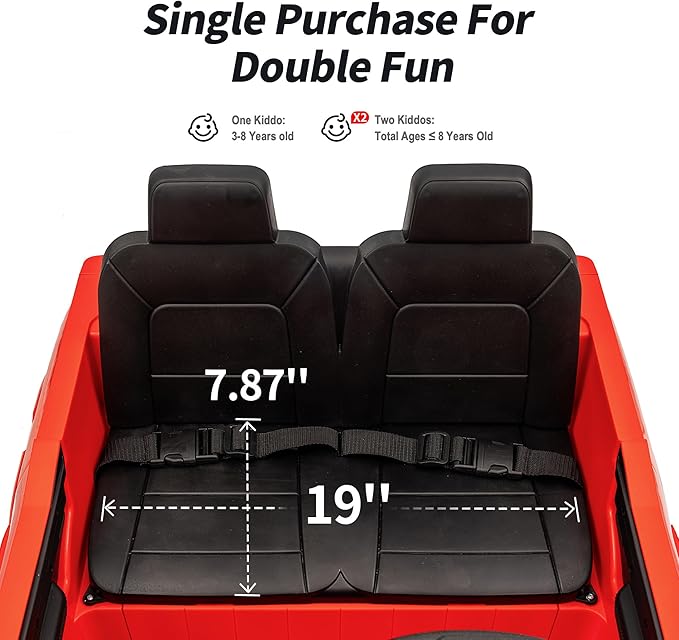 - 19" DUAL SEATER : This battery powered police kids car has ample seater, allowing two children to ride together comfortably under 110lbs. Adjustable seat belts and double-locking door design also ensure kid's safety.