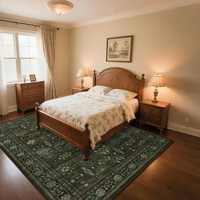 8x10 Washable Area Rug for Living Room, Non Slip Vintage Floral Print Rugs No Shedding, Distressed Thin Retro Accent Carpet for Bedroom Nursery Farmhouse Dining Room Dark Green