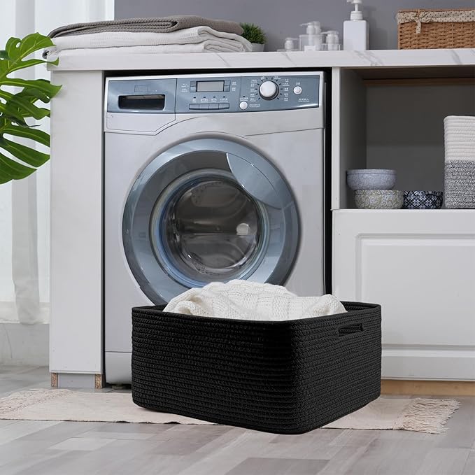COMFY-HOMI Cotton Rope Woven Basket with Handles for Shelves,Toys,Book, Cloth Storage Baskets for Organizing-17" x 13" x 7.5" Toy Decorative Organizer for Living Room, Bathroom (all black)
