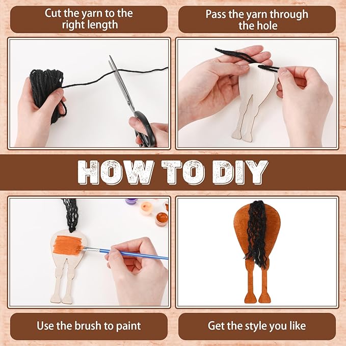 - 24 Set Wooden Horse Cutout Kit: unleash your imagination with this complete wooden horse craft kit; It includes 24 unfinished horse cutouts, 2 sets 12 color paints, 4 paintbrushes, 8 rolls of yarn in different colors, ready to be transformed by your creativity