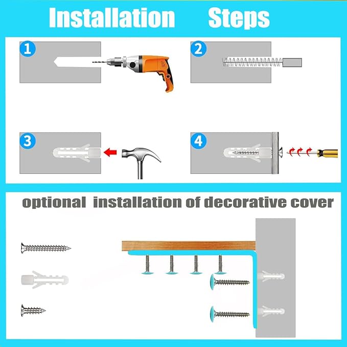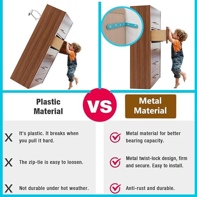 - Package Includes(furniture anchors for baby proofing): Furniture anchors Use the hardware components included in the package, and baby furniture anchor Package Includes:All parts made of high quality steel, includes4 pack Stainless steel bracket, 8 pcs Long wall screws, and 16 pcs Wall anchors 8pack expansion nails plugs y to install with a screwdriver or drill driver.