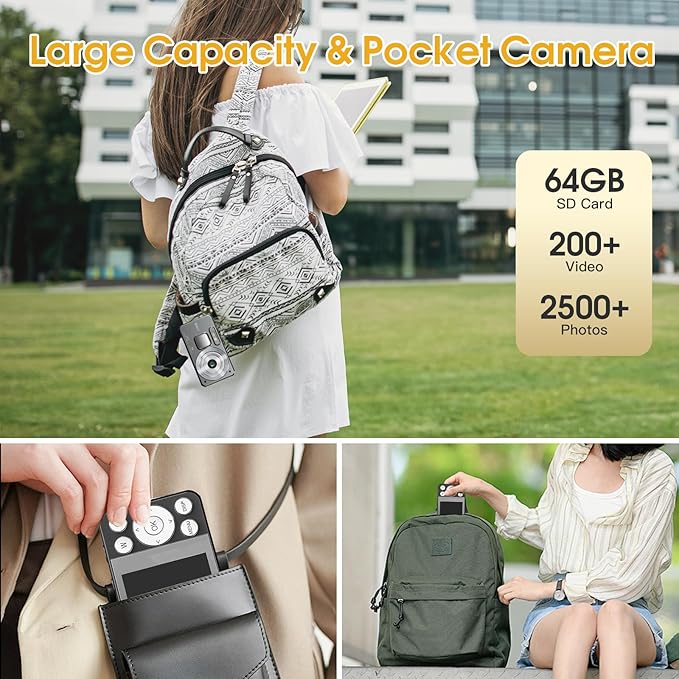 - 【Portable & Versatile Features】The portable camera is slim enough to fit in your pocket. It with rear HD selfie mirror, you can see your beautiful self from the selfie mirror, making your photos more natural and beautiful. And it supports H.264 encoding, MOV format, videos or photos uploaded to mobile phones or computers can be played directly, share beautiful moments anytime, anywhere.