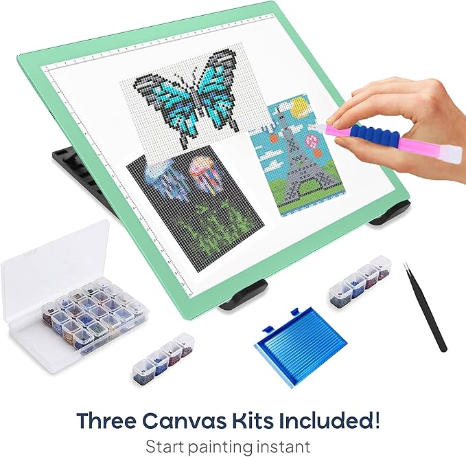 - Everything Included – Comes with 1 x EVA carry bag, 5 diamond painting pens (different types), 20 glue clay, 1 roller, 3 trays, tweezers, clips, fixing tool, reclosable bags, stickers, pen covers, and a sturdy stand—making it one of the most complete diamond painting light board sets on the market