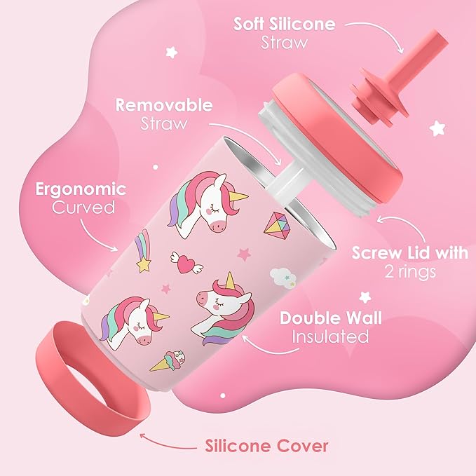 Kid Insulated Stainless Steel Tumbler with Silicone Straw, 12oz Sippy Cup for Kids (Dreamy Unicorn)