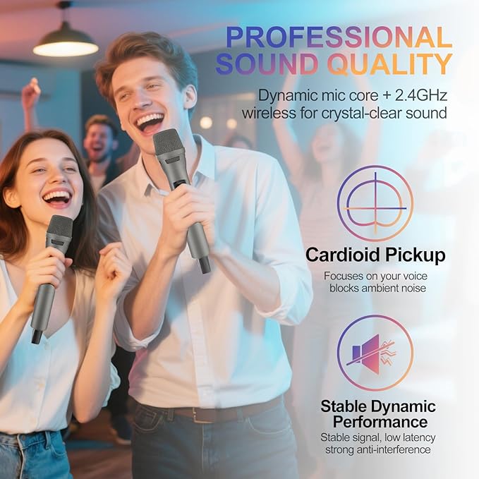 - 🎤 CRYSTAL-CLEAR, PROFESSIONAL SOUND - Unleash your inner star! Equipped with a professional dynamic mic core and advanced DSP noise cancellation, our wireless microphone delivers stunning, high-fidelity vocals. It faithfully captures every note and word, free from annoying distortion, static, or delay—perfect for karaoke, streaming, and commanding the stage at weddings and events.