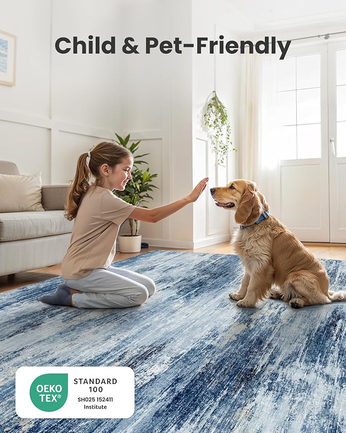 Amada 6x9 Washable Area Rug, Modern Abstract Living Room Rug with Non-Slip Backing & Short Pile, Large Rug with Abstract Pattern for Living Room, Bedroom and Dinning Room, Blue