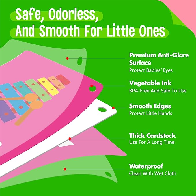 - Premium Quality: Made from thickened cardboard, durable enough for teething babies. Coated with premium anti-dazzle film, easy to recognize and protect babies’ eyes as well. Printed with non-toxic vegetable oil-based high gloss ink, BPA-free and safe to use. The rounded corners and smooth edges are safe enough for babies’ small hands to grab.