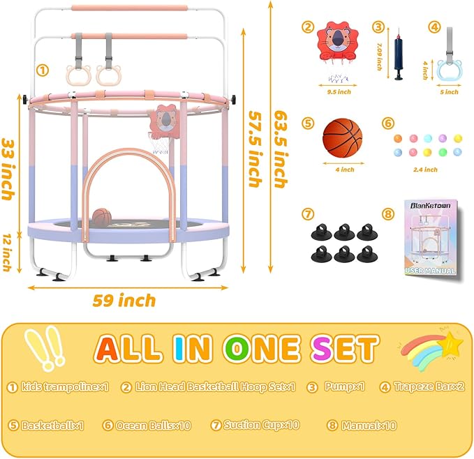 - 【4-in-1 Multi-Purpose Play Area 】Transform your backyard or game room! The indoor trampoline for kids 2-5 includes a basketball hoop, gymnastic bars, hoops and ocean balls. Kids can jump, climb or imagine adventures in their own private bounce house that will keep them active and entertained for hours.