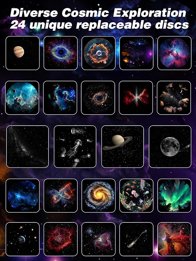 - Wide Variety of Discs: Discover a stunning collection—from constellations and starry skies to the Milky Way and planetary scenes. This projector brings the awe-inspiring beauty of space right into your room. We've thoughtfully curated a special disc set for kids to ignite their curiosity and inspire a love for exploring the universe—with even more exciting discs on the way.