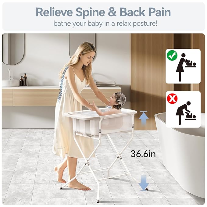 - 【Save Your Spine & Back】Engineered with ergonomics height, this baby bathtub with stand eliminates 90% of spinal & back strain caused by floor kneeling. Adapts to 150-200cm parents. No more numb legs or aching backs after bath time! The drain hole on the bottom can empty the water easily without bending over.